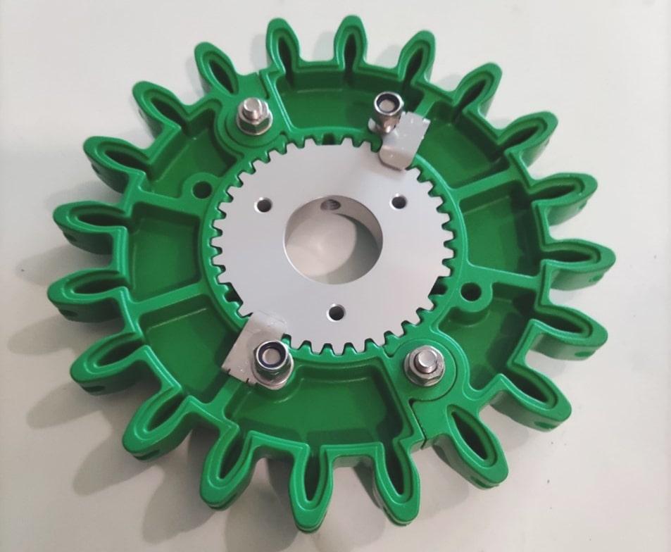 Un albero verticale in acciaio inossidabile, azionato da un motoriduttore posto alla base, trasferisce il moto al nastro trasportatore attraverso dei pignoni di trascinamento posizionati ad ogni livello della spirale: il nastro inoltre è dotato esternamente di “denti” che vengono ingranati appunto dalle ruote preposte.