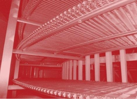 I trasportatori a spirale ME Food Solutions prevedono un tipo di nastro evoluto: DLS-EVO è un “know-how” brevettato e realizzato mediante la fusione elettrica di barre di diametro 6 mm ad una speciale catena estremamente robusta, con passo 32 mm. Sulla catena sono presenti denti profilati saldati in 4 punti che garantiscono una resistenza meccanica assoluta e permettono al nastro di essere ingranato dalle ruote del traino. Tutte le parti sono realizzate in acciaio inossidabile AISI 304, standard massimo per il settore alimentare.